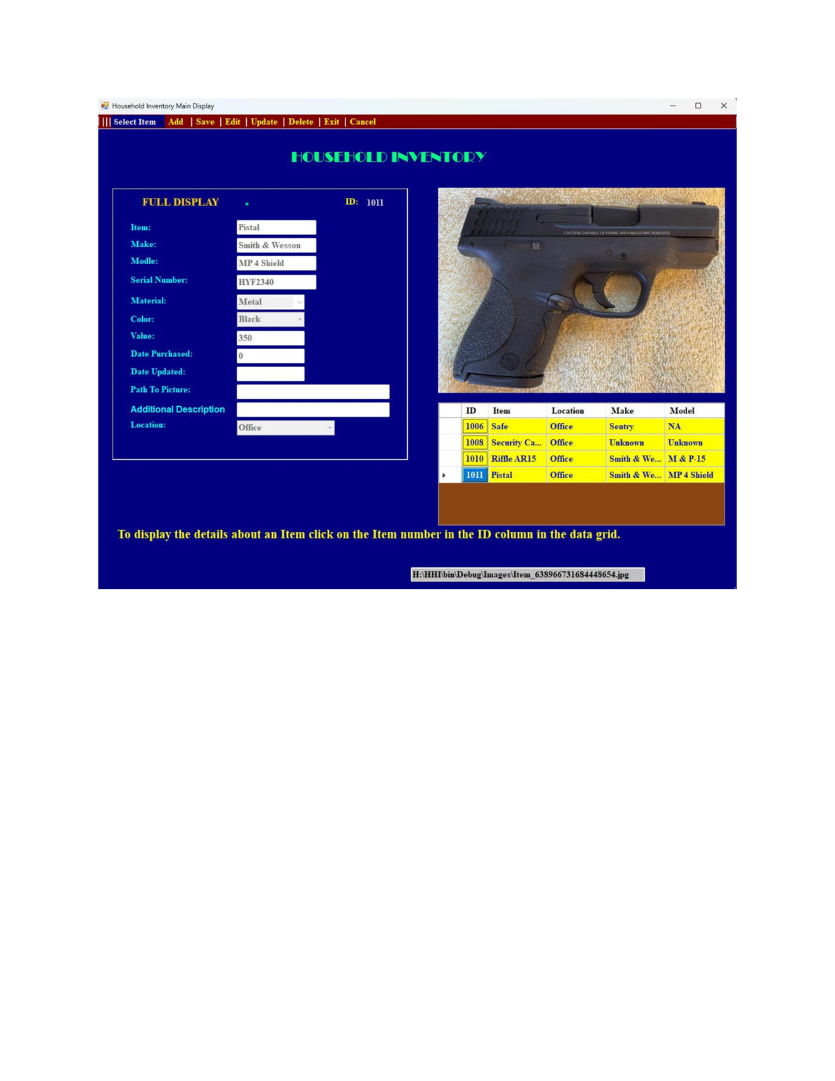 This is the main display where you can display an item along with it’s picture, Add a new item, Edit an existing item or delete an item.